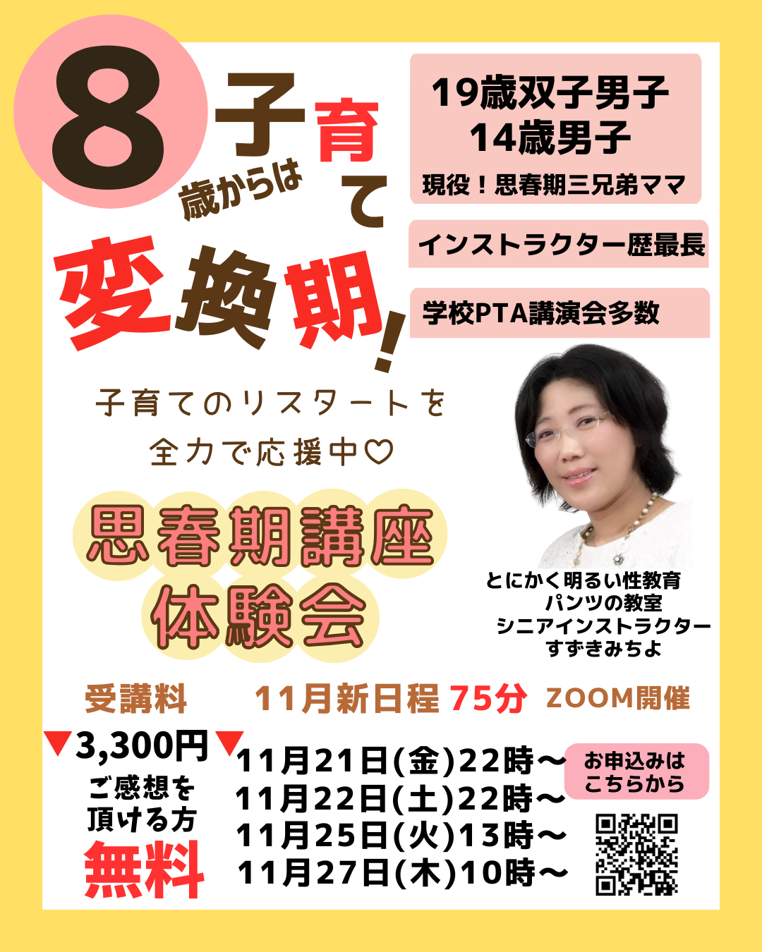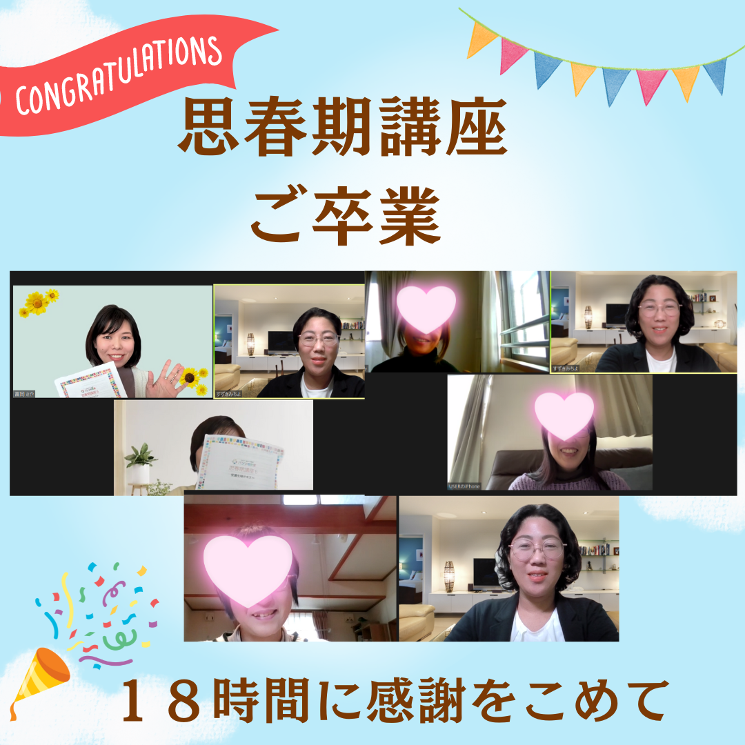 お子さんが、まだ小学校低学年以下の方も受講されており、「思春期前に知ることができて、安心して思春期を迎えられます」との感想も頂いています。